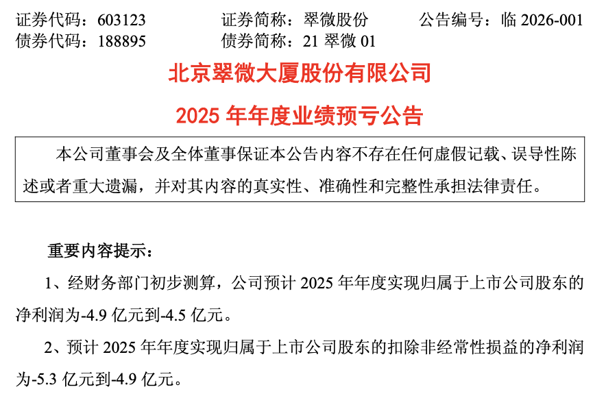 1月16日,翠微股份(603123)披露2025年度业绩预告,经财务部门初步测算,公司预计2025年年度实现归属于上市公司股东的净利润为-4.9亿元到-4.5亿元。与上年同期相比,减亏1.97亿元到2.37亿元。