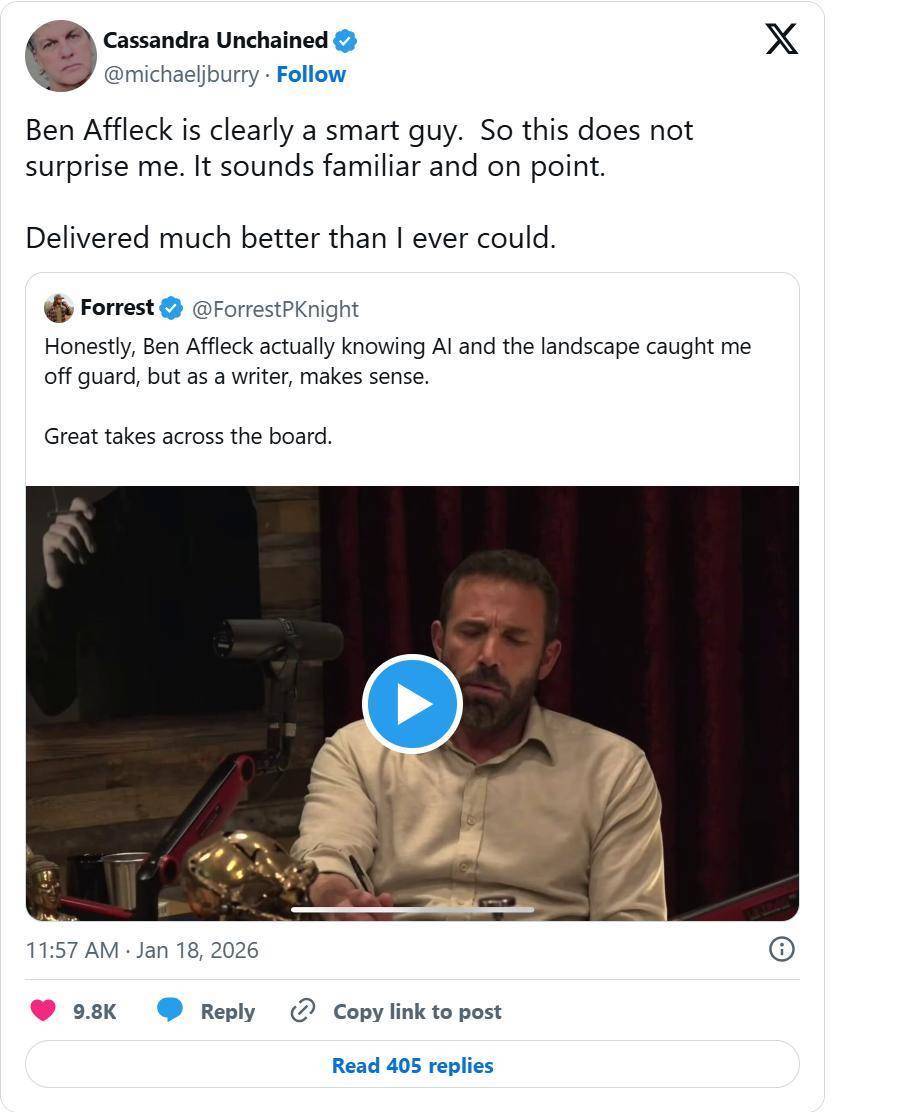 “本・阿弗莱克显然是个聪明人。”伯里于上周末在社交平台X上发文称,“所以他的这番表态并不让我意外,听起来既耳熟又切中要害。”