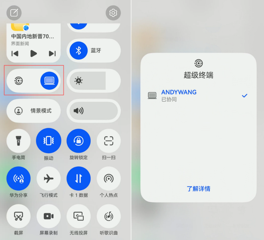 刚开始用的时候,还担心连接会很复杂,毕竟以前用其他品牌的多屏协同功能,光是配对就要折腾半天,有时候还会断连。但HarmonyOS 6的连接逻辑真的很简单,要么把手机和电脑NFC感应区碰一碰,要么在电脑状态栏打开超级终端,找到手机图标拖过去,两秒就能连好;或者打开手机控制中心,在“超级终端”里一眼看到我的电脑名称,点击都能实现“多屏协同”。笔者试过在办公室、咖啡馆、家里不同环境用,基本没遇到过断连的情况,就算不小心把手机拿开,再放回去也能快速重新连接,点击一键回连,不用反复设置。